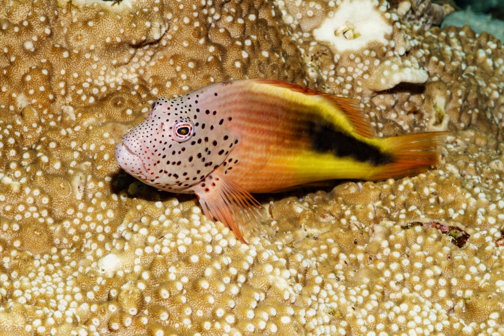 A Freckled Hawkfish and an Arc Eye Hawkfish were also perching on the corals, waiting to pounce on passing prey.