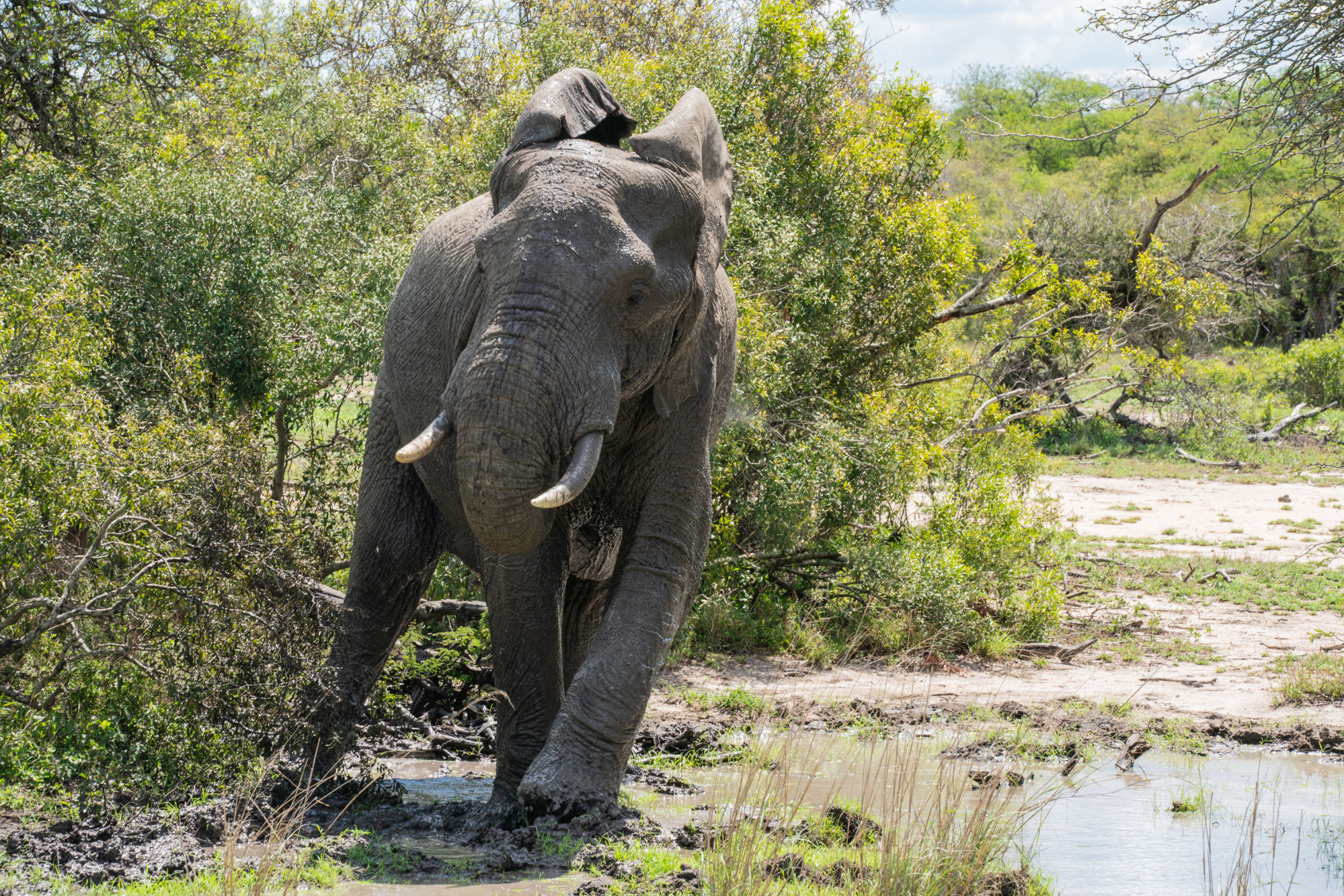 An elephant came strolling along, first spraying itself with water at a water hole close to the road and then casually strolling up to a tree and pushing it over.