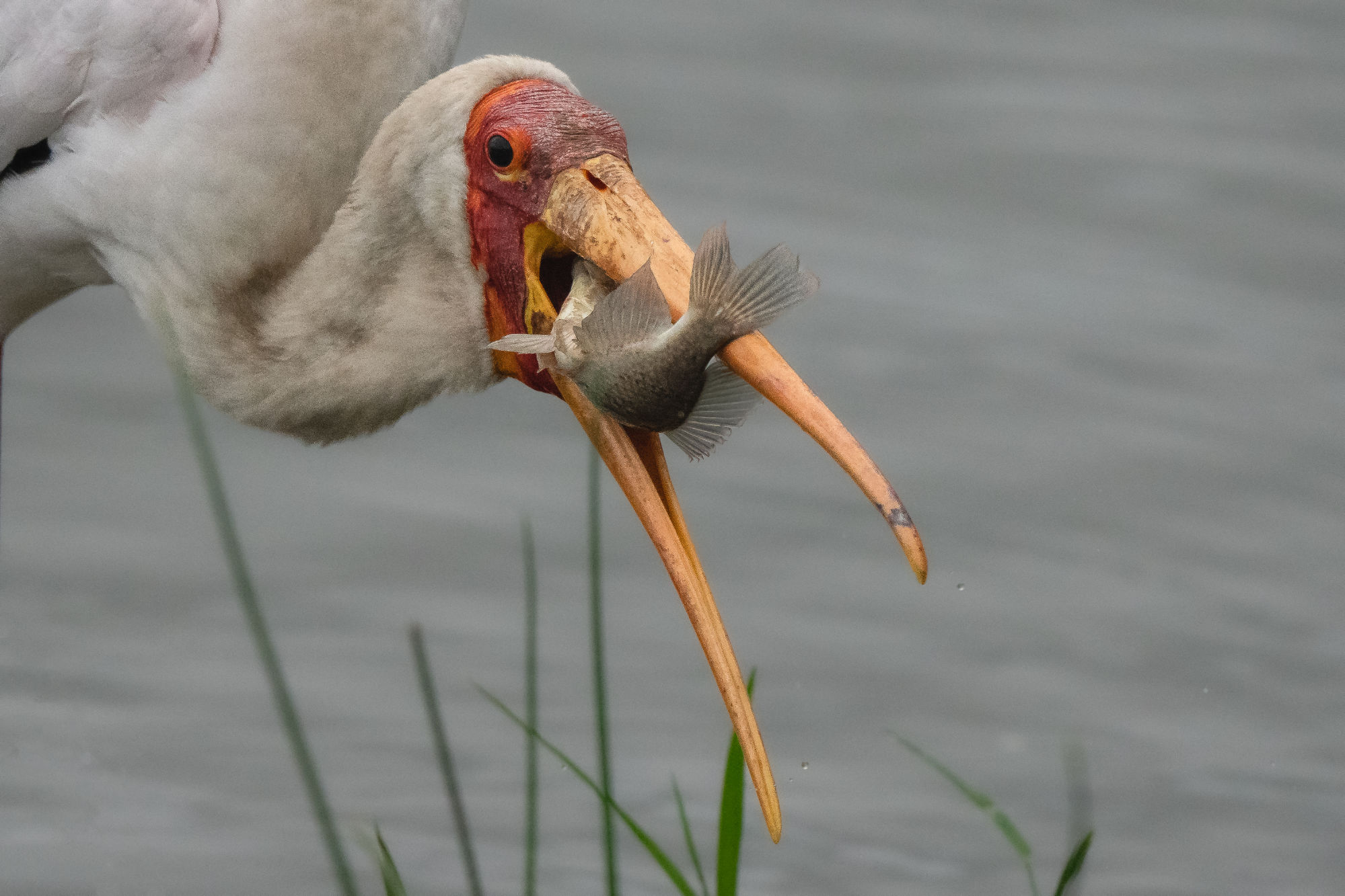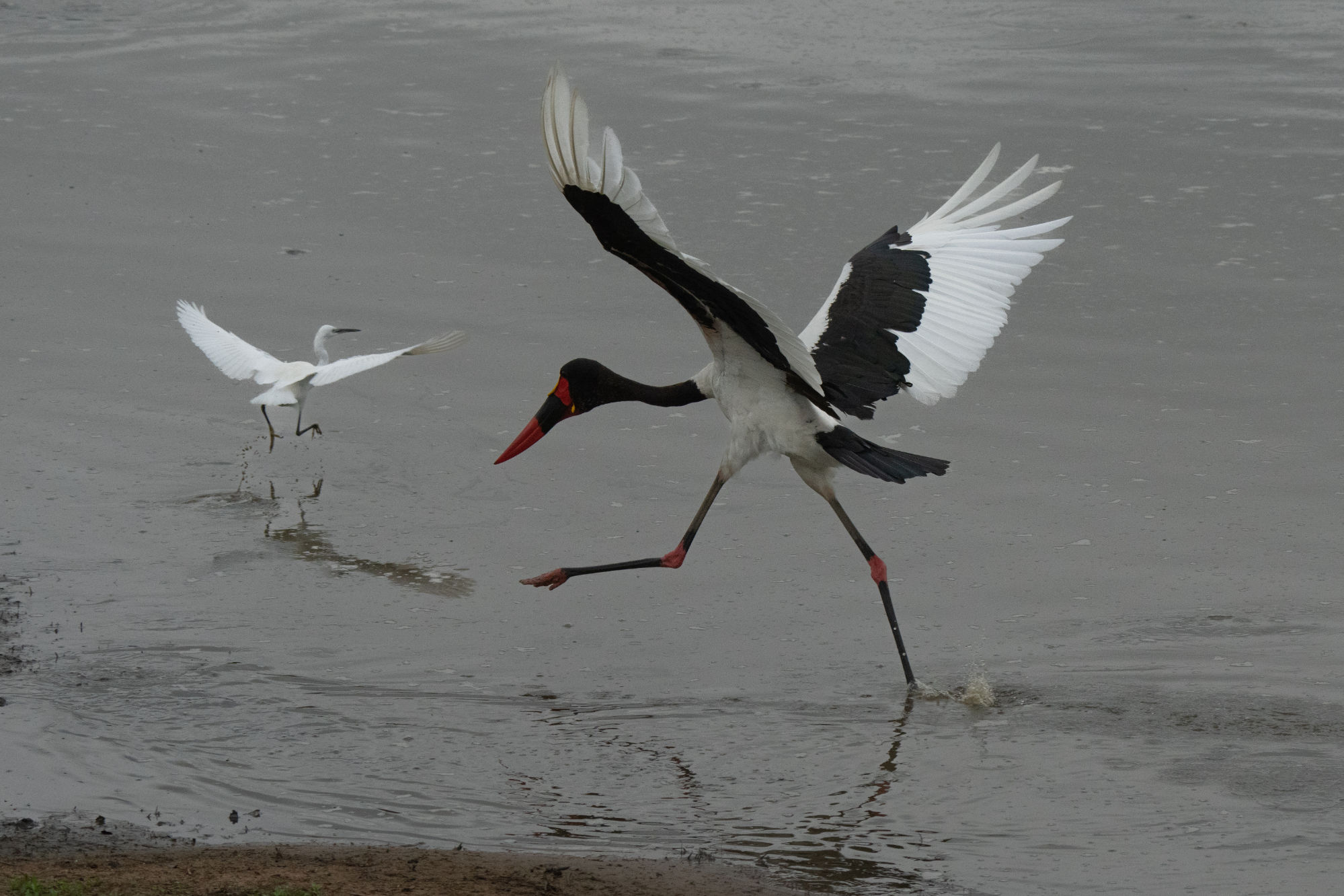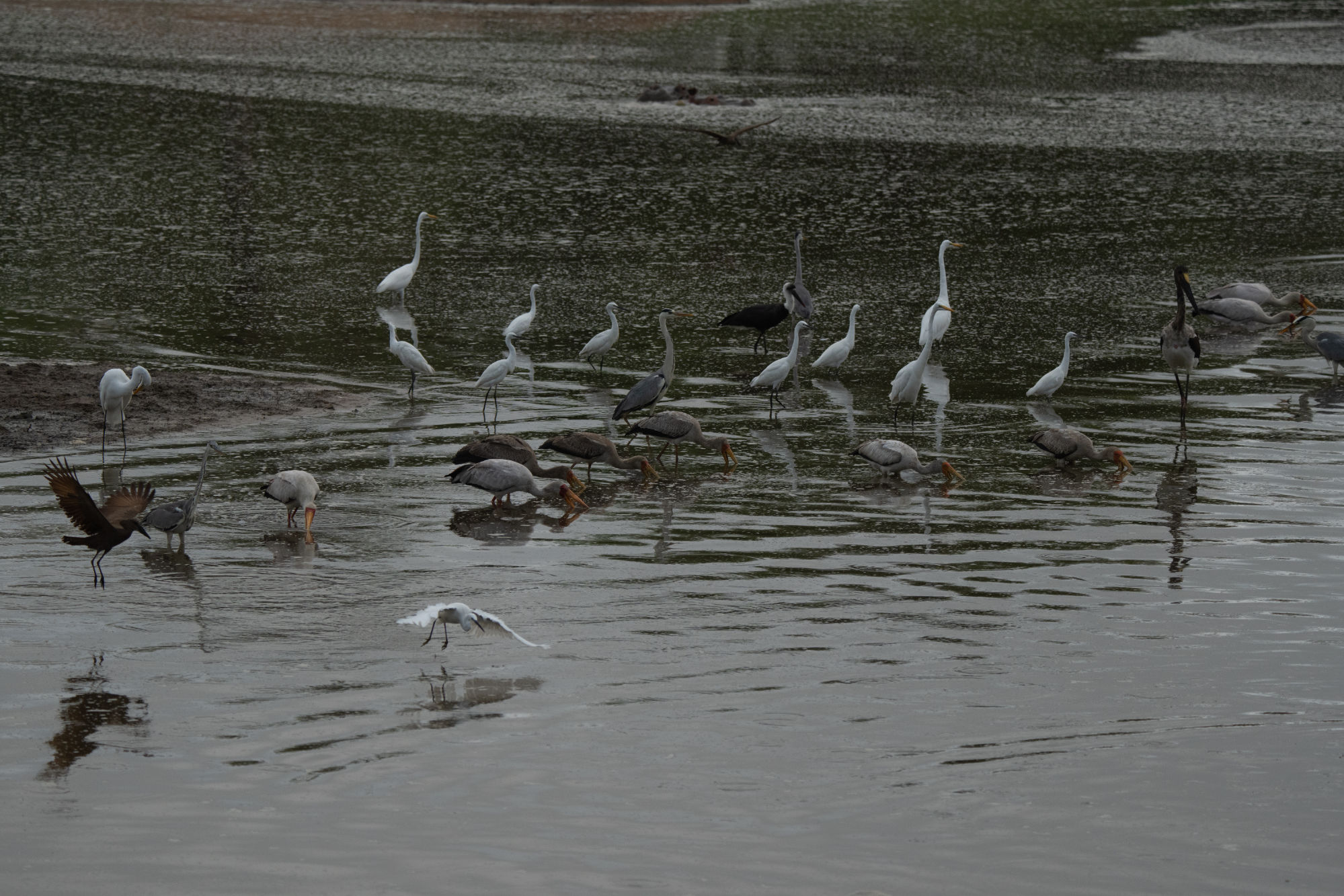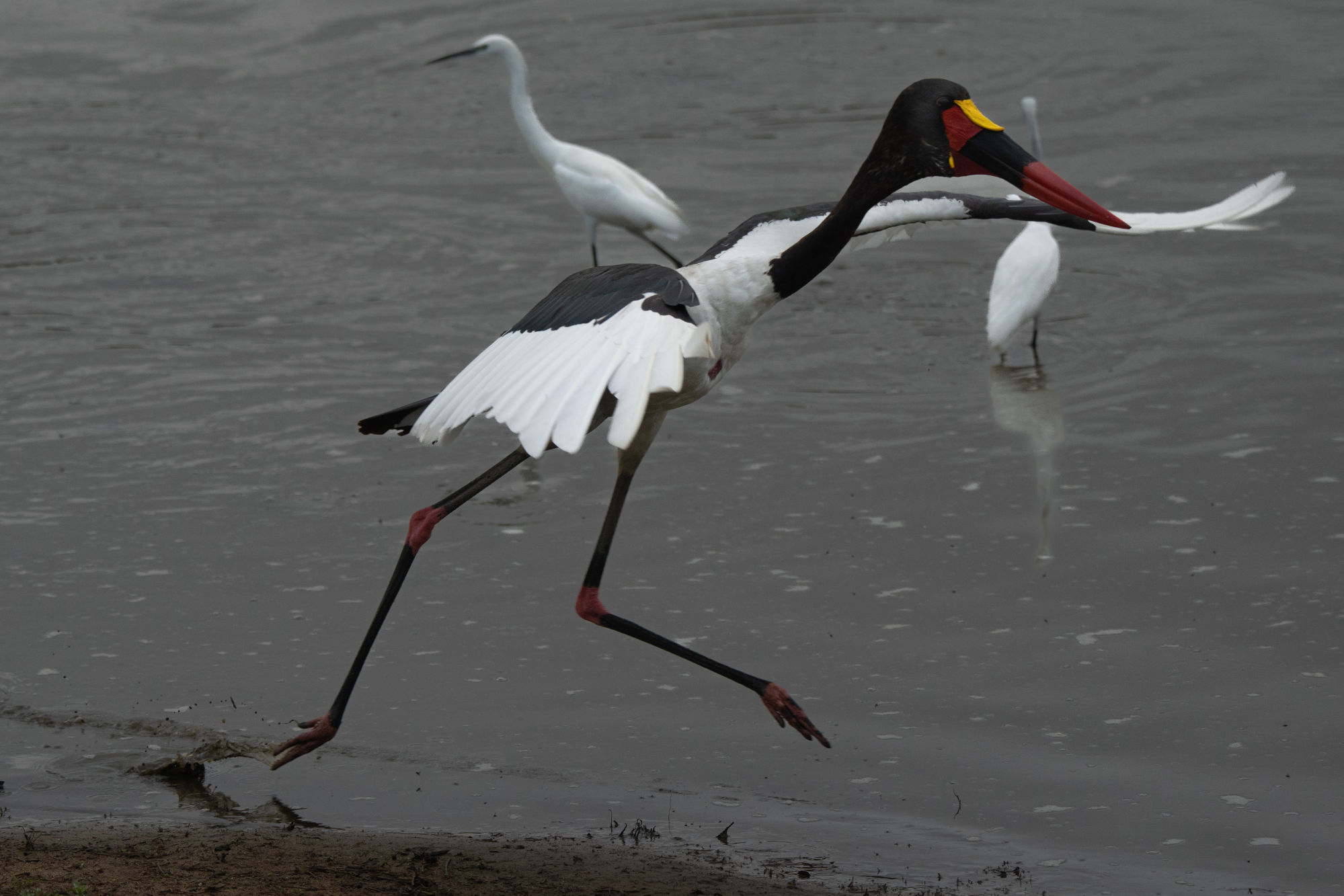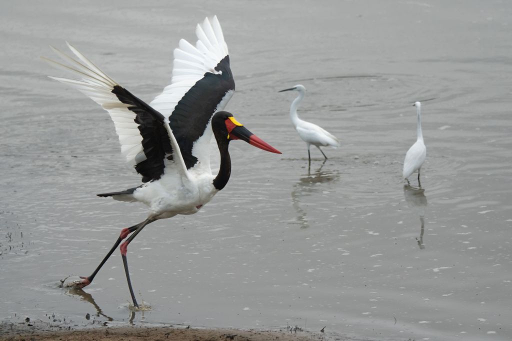 The Saddle Billed Stork did not like the others encroaching on his fishing spot and kept chasing them away.