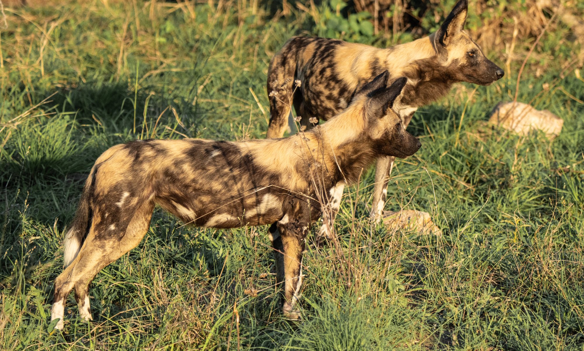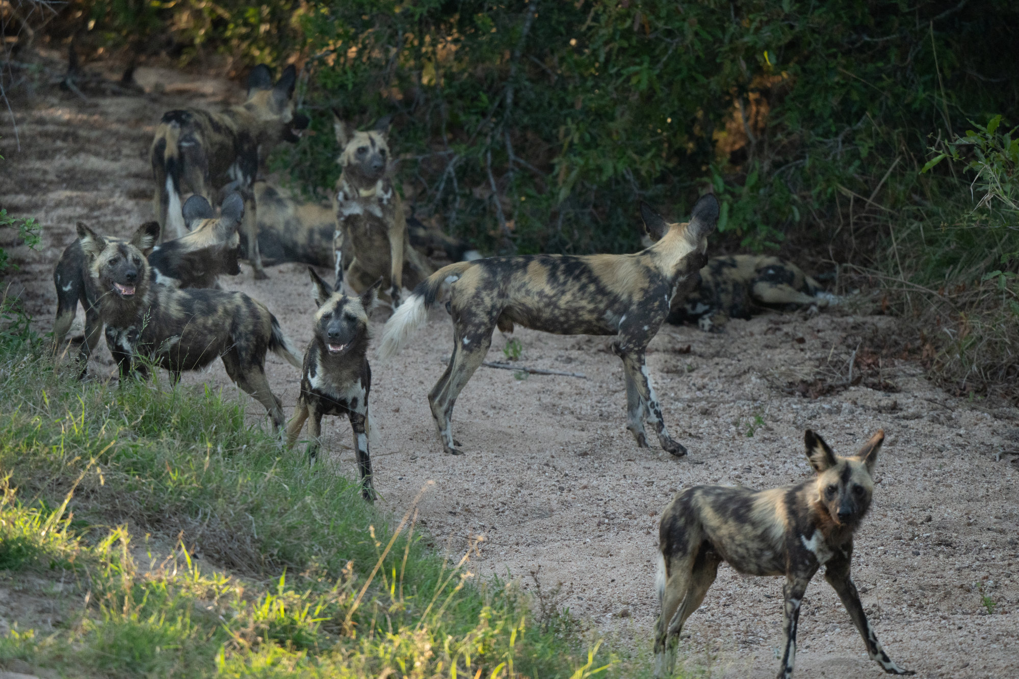After spending a while and deciding that he was unlikely to move soon, we carried on to the wild dog sighting. Arriving there, we were the only vehicle nearby and thus got a prime viewing spot. They were lying in a dry riverbed, most of them fast asleep. We sat watching them for a long time, but we decided to wait until the last possible minute before returning to camp. Our patience was well rewarded as they eventually woke up, started moving and crossed the road right in front of us.