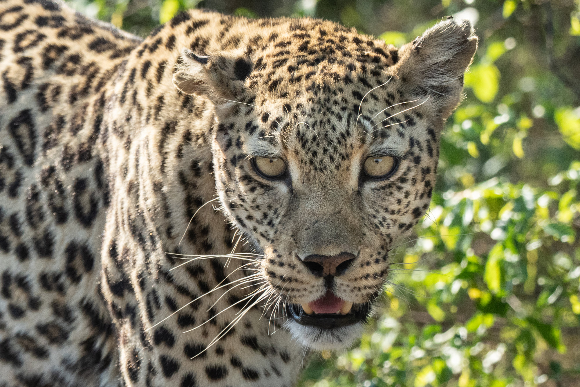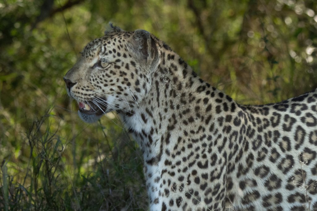 The afternoon ride started with promise of leopard and wild dog sightings which had been reported during the morning. On our way to the first reported leopard sighting, to our great surprise, coming around a corner, we saw a leopard strolling along the road towards us. She crossed in front of us and casually disappeared in the bush.