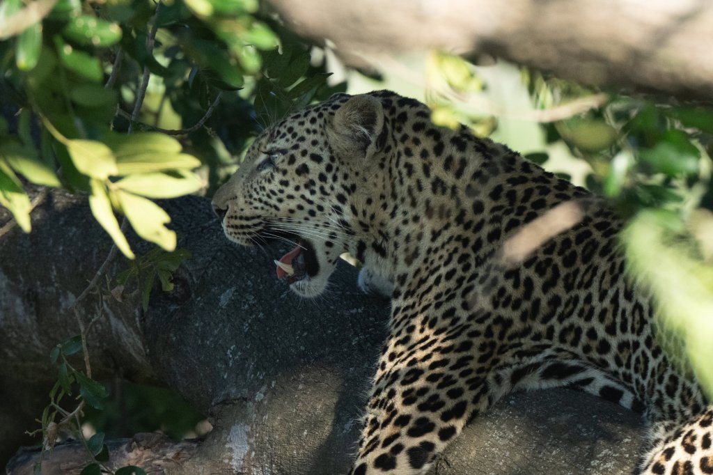 Carrying on to the reported leopard sighting, we spotted the leopard’s prey in a tree and a large leopard resting on a branch.