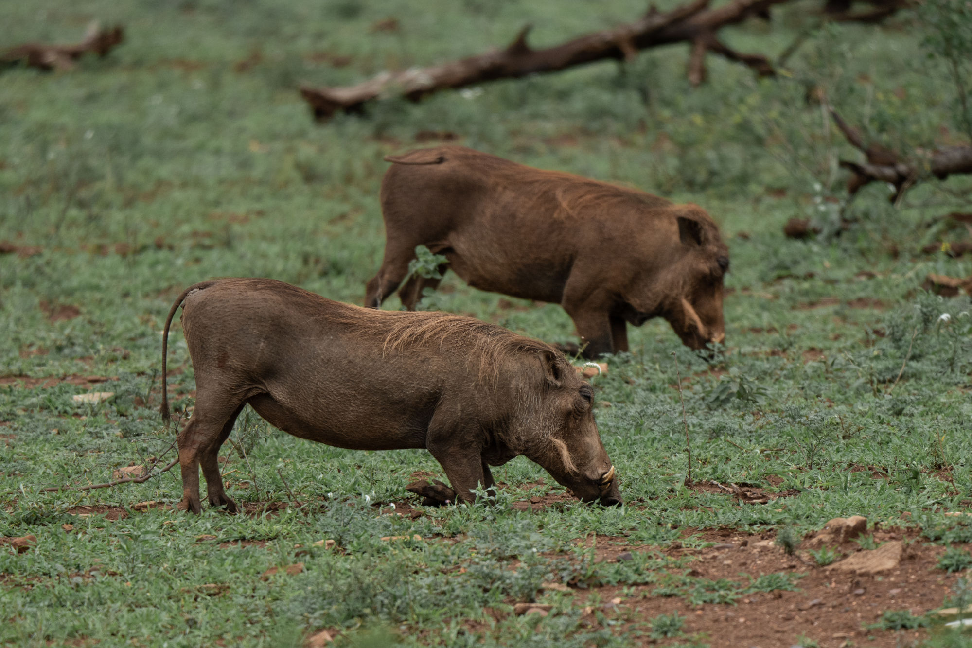 warthogs kneeling for their food, a surprise shot containing three animal species