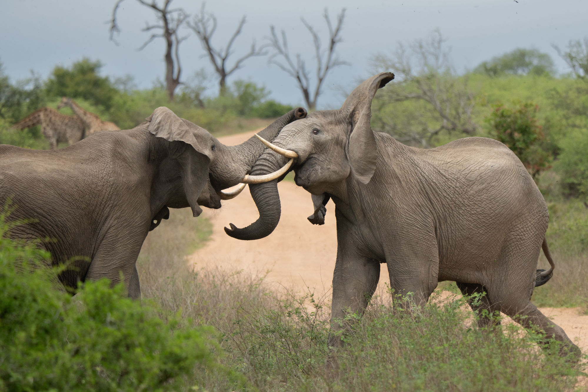two elephant bulls tussling, two Kudu bulls tussling,