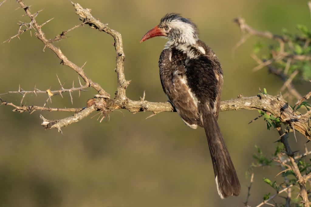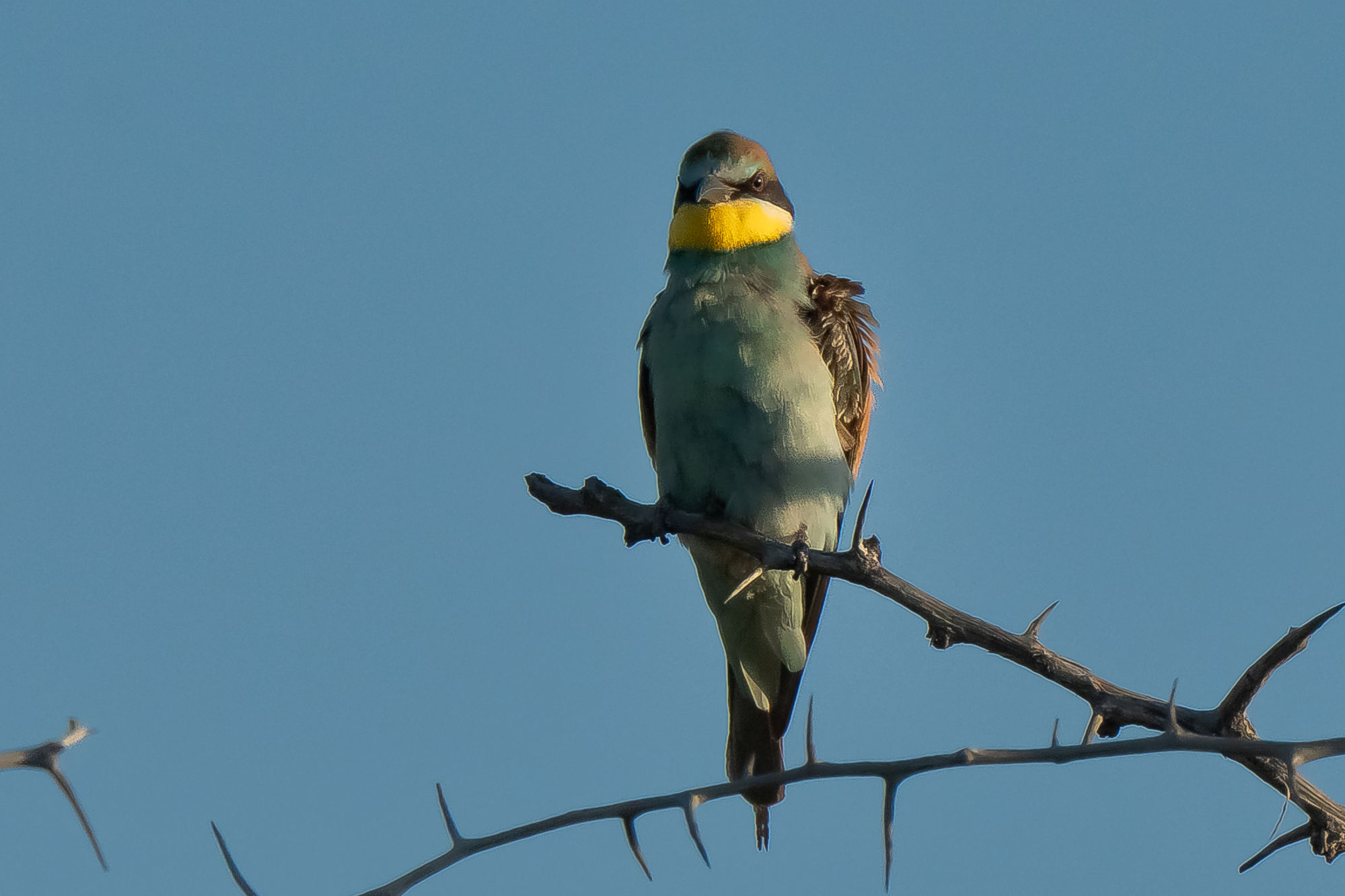 We were surprised by a swarm of European Bee-eaters. Despite multiple attempts, I was unable to photograph one of these birds in flight, they are just too small and fast, with unpredictable flight patterns. Thus, I had to be satisfied with a shot of one sitting on a thorn tree branch.
