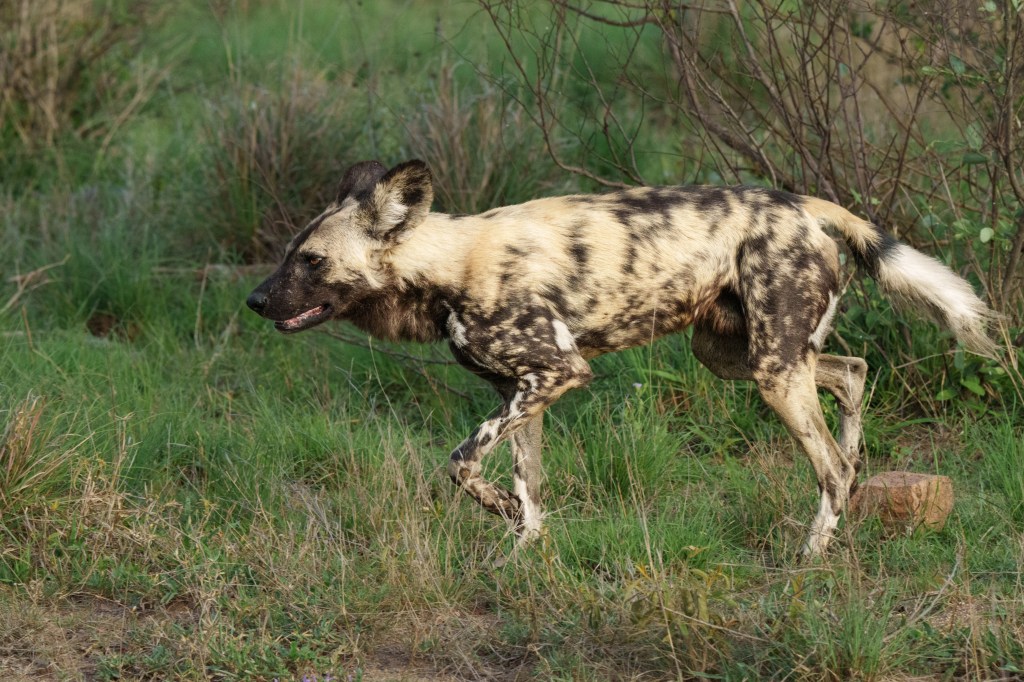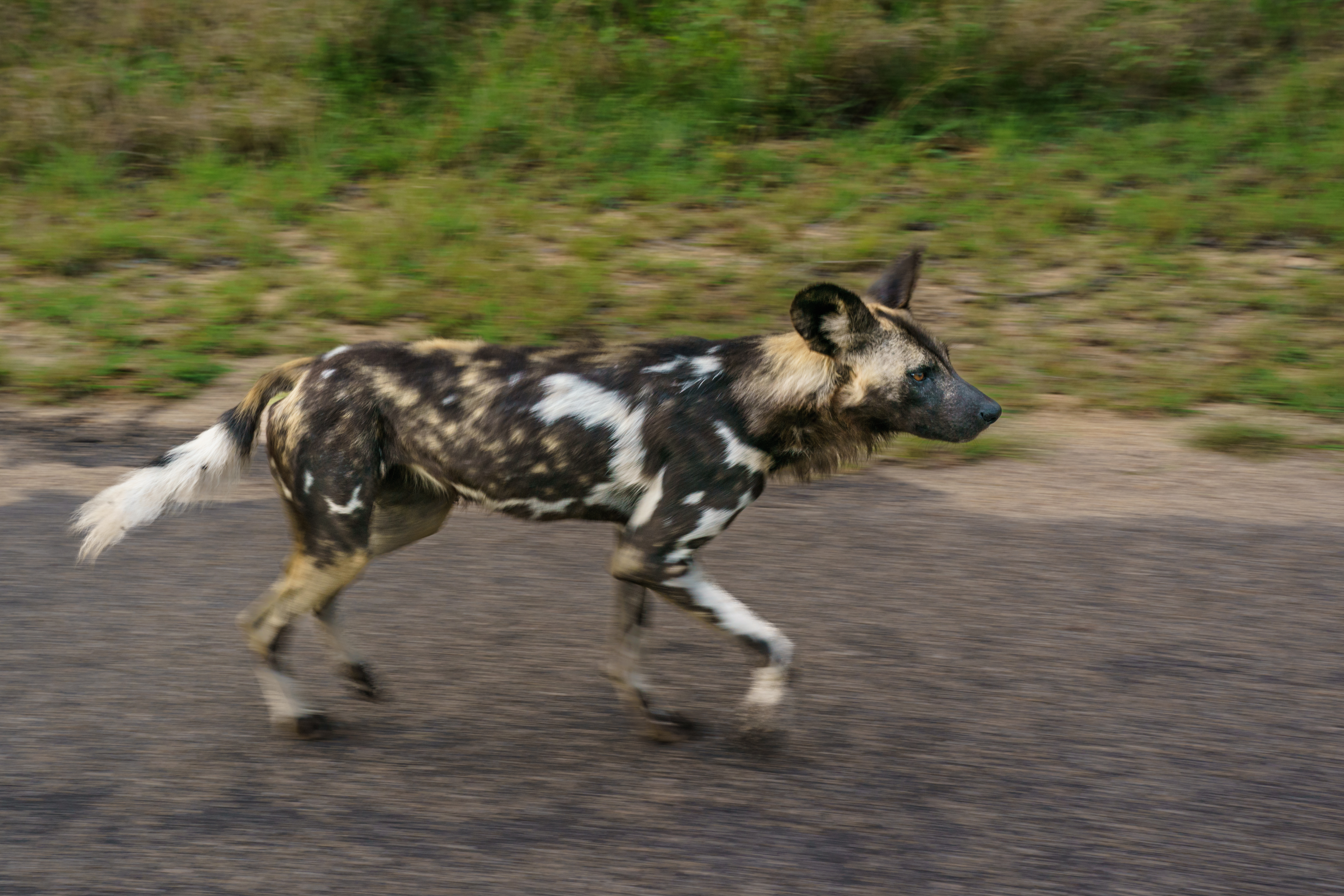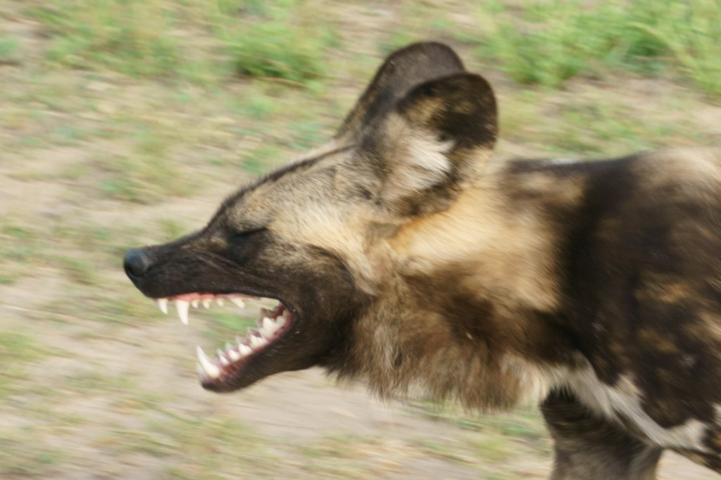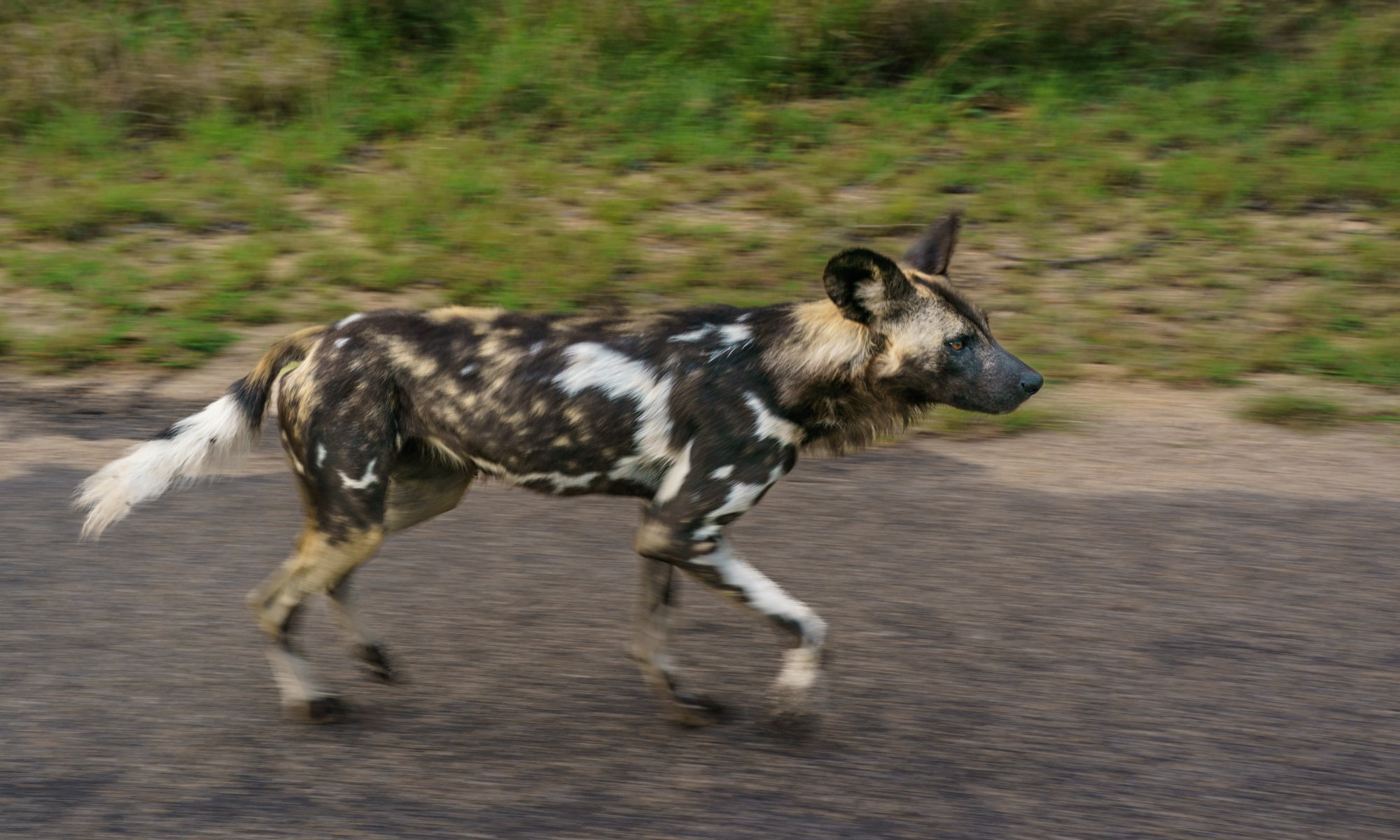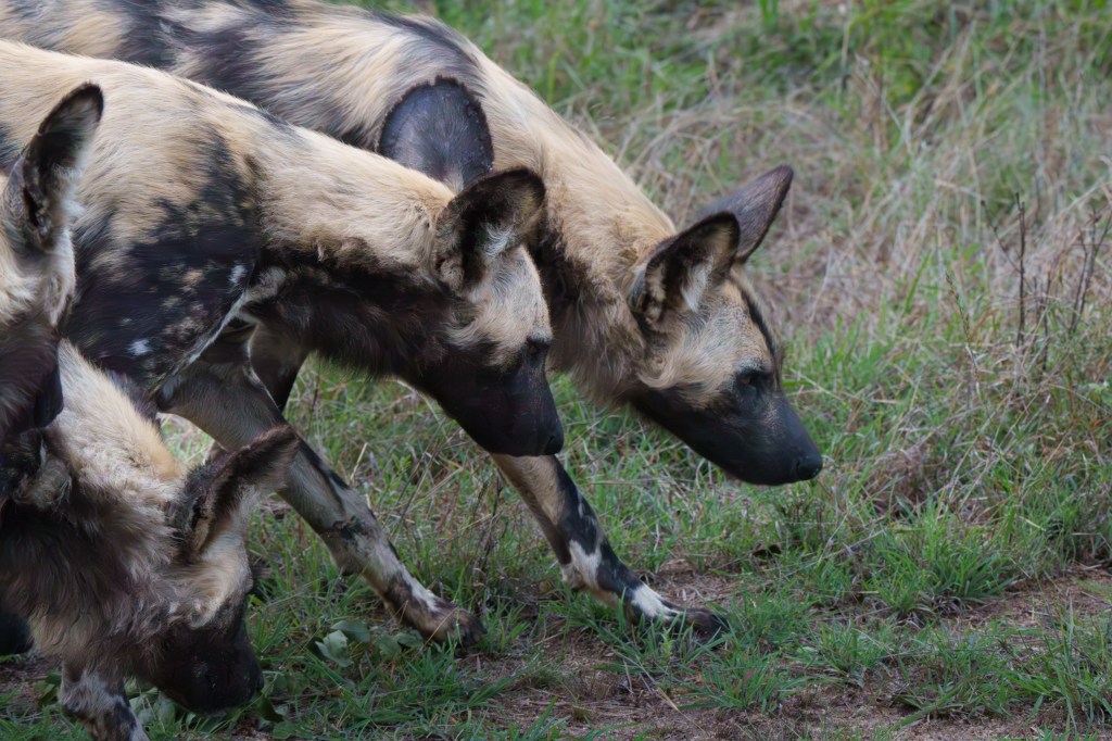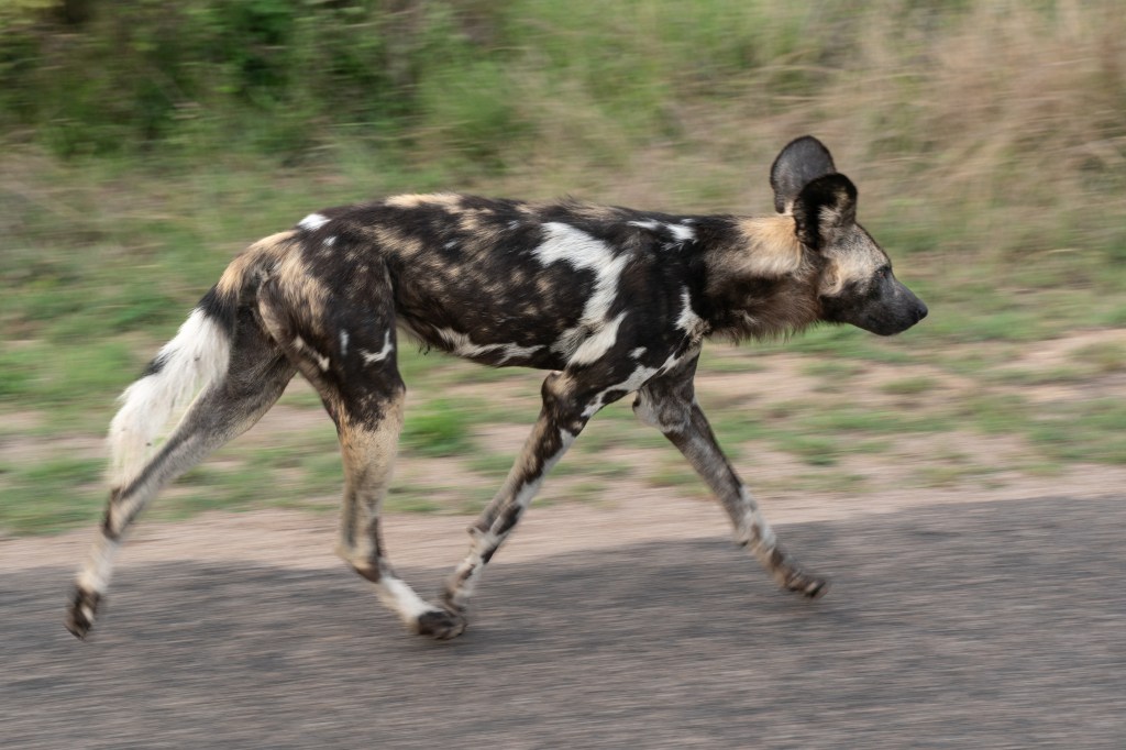 While we sat watching them, Hennie got word of a pack of Wild Dogs nearby. We immediately abandoned the hyenas and set course for the Wild Dogs. We arrived to find a pack of thirteen of them jogging along the road and fooling around with one another.