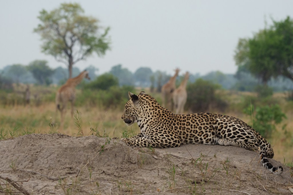 The young male leopard we had seen on a previous day, was lying out in the open on a termite mound, watching the passing giraffes, giving us ample photo opportunities, before disappearing into the trees