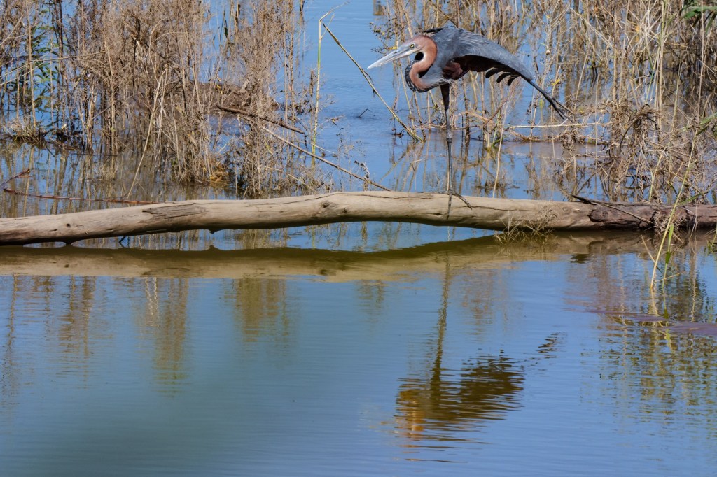 A Goliath Heron was doing its streches on a tree stump at the edge of the river.
