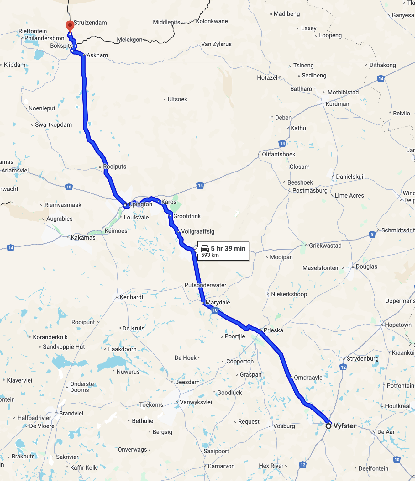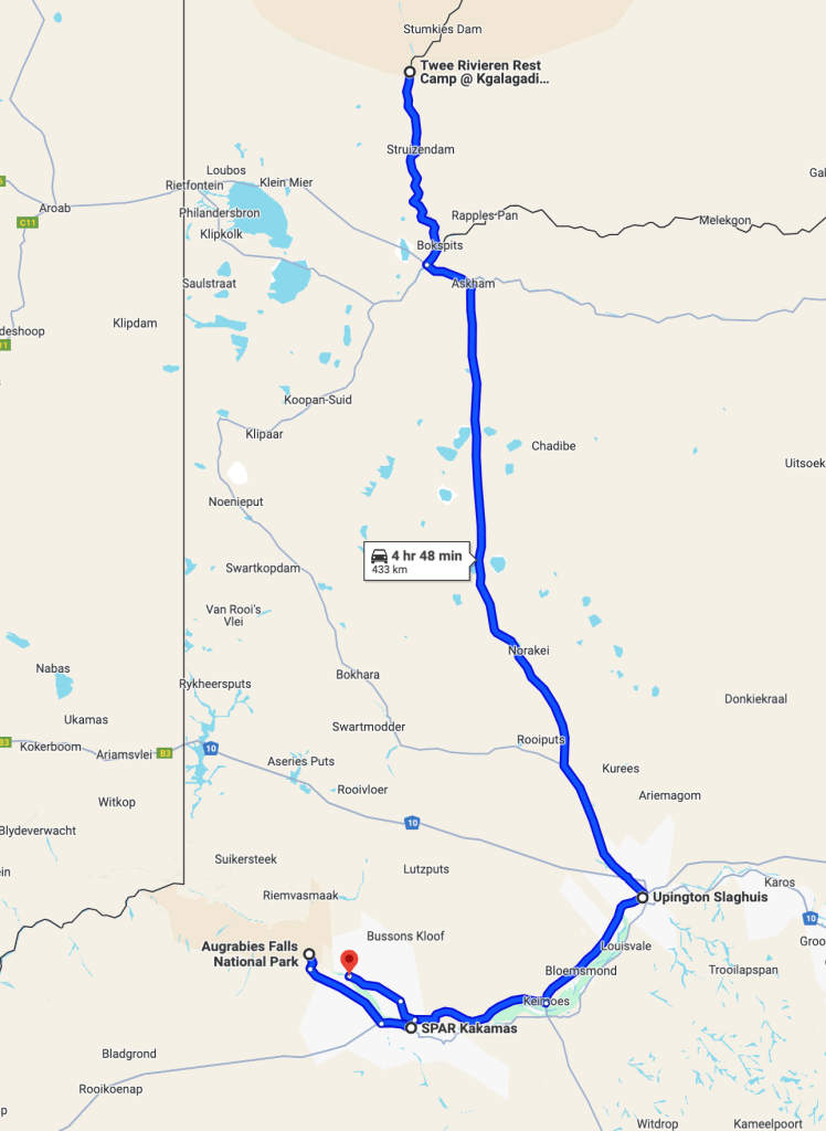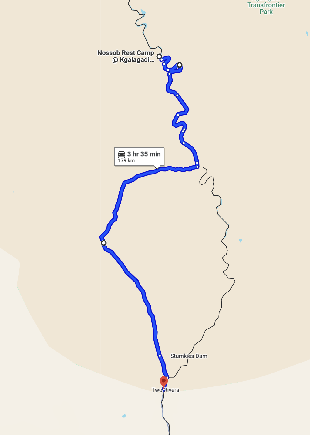 Nossob to Twee Rivieren : On this day we took a detours to 13th and 14 boreholes, not recognised by Google Maps and therefore not visible on the map. You will have to use a paper map of Kgalagadi Transfrontier Park to see those.