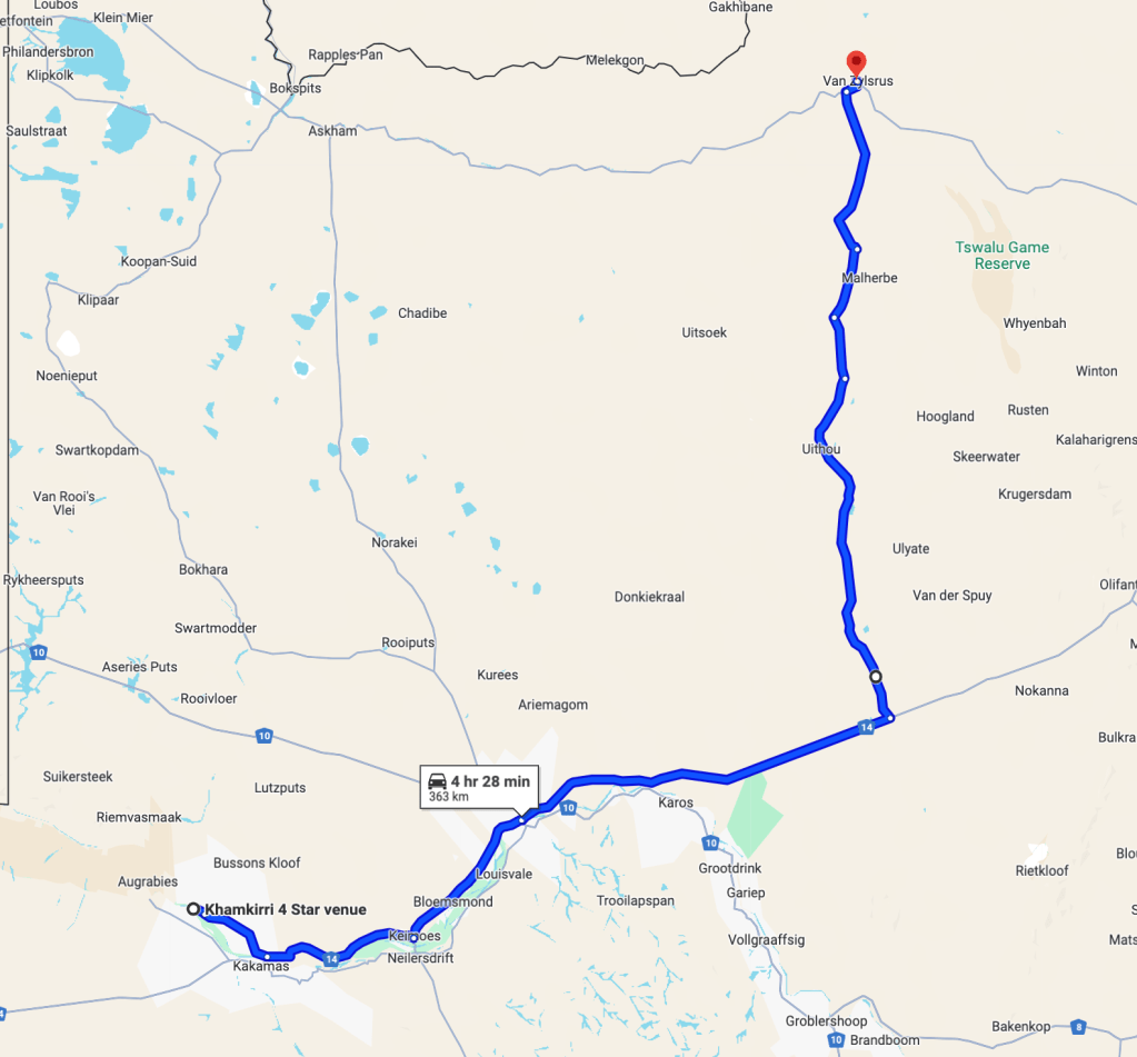 Van Zylsrus to Witsand Kalahari reserve : because of heavy rain on the day we were traveling here, as well as damage to the roads by heavy rains some days earlier, we wanted to avoid the gravel roads and took quite a detour in order to stay on tar roads. In different circumstances, we would have chosen a very different route between Van Zyslrus and Olifantshoek.