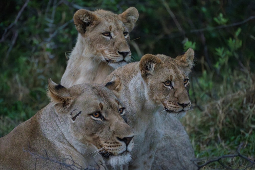 In the overcast conditions, darkness arrived rather quickly, with none of the previous days’ spectacular sunsets. Just before dark, we found a group of two lionesses with 8 cubs. With aperture wide open, shutter speed as slow as I was comfortable with while shooting handheld and ISO as high as I was comfortable with, the photos were still very dark and some work in Lightroom and Topaz Denoise was required afterwards to make them usable.