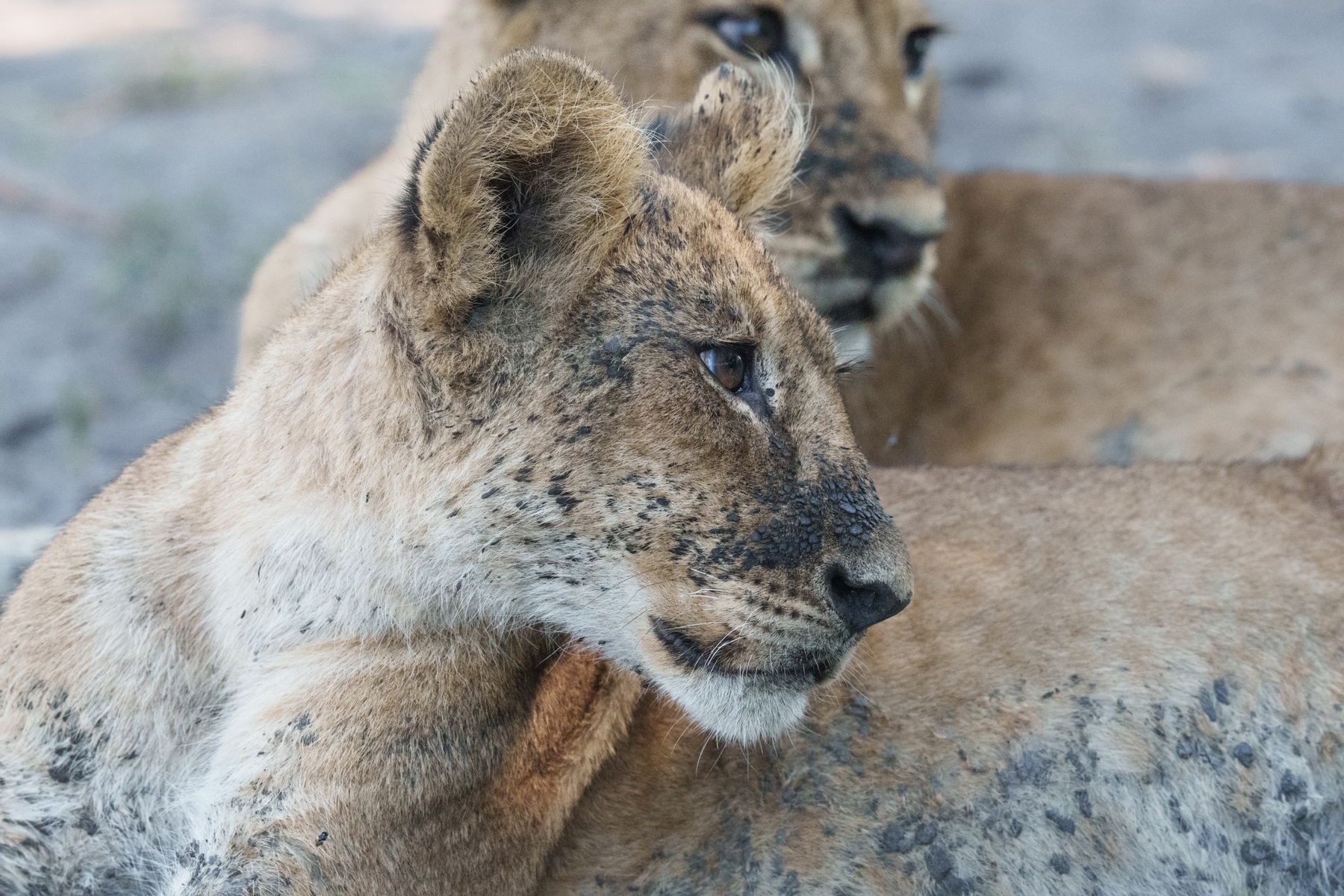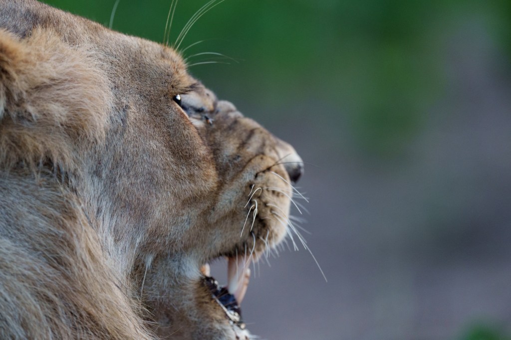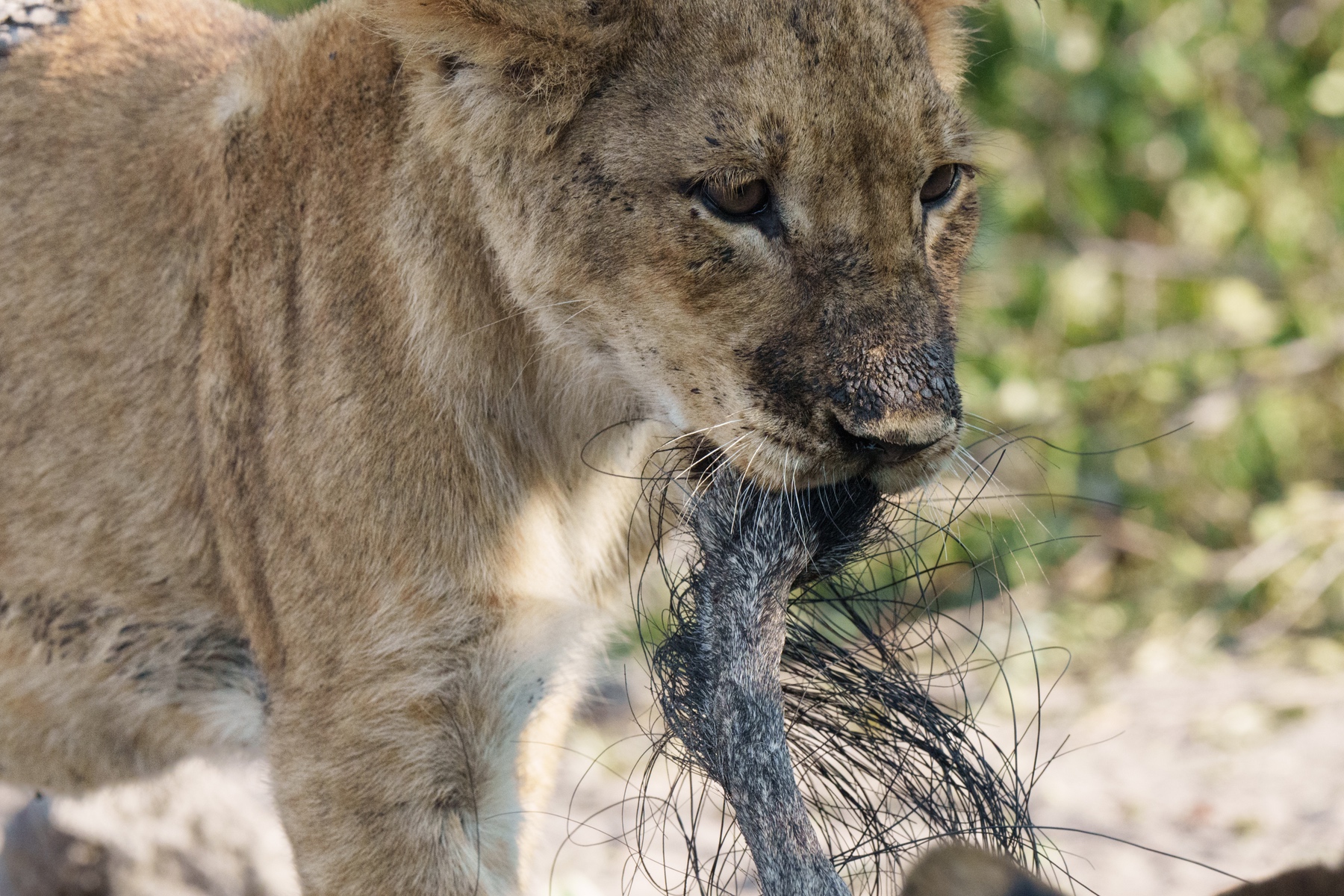 All too soon we had to move along and allow others their turn at the sighting. Driving along on our way back to the lodge and aware that we were going to be quite late for brunch, we just had to make a brief stop when we saw a group of four lions chewing on the remains of a wildebeest right next to the road.